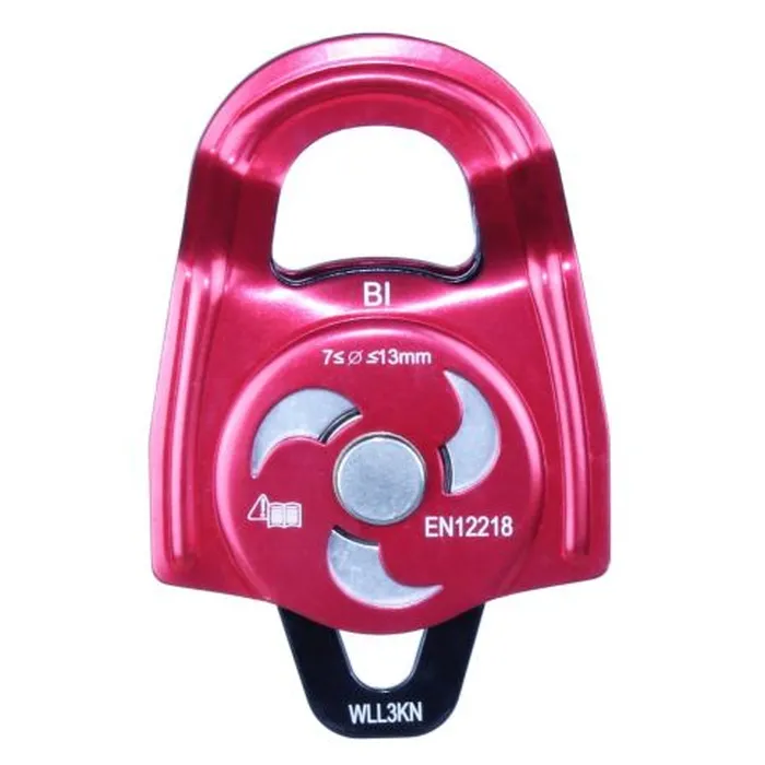 Indicada para cordas de 7 mm a 13 mm de diâmetro, é fabricada com placas laterais em duralumínio anodizado e roldanas em aço polido, oferecendo excelente resistência mecânica e durabilidade. Apresenta carga de ruptura total de 36 kN (9 kN por lado) e carga máxima de utilização recomendada de 1.200 kg, sendo ideal para aplicações técnicas e profissionais.
